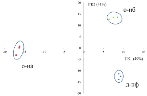 Рис. 4.9. График счетов ГК1-ГК2 МГК-моделирования вольтамперограмм