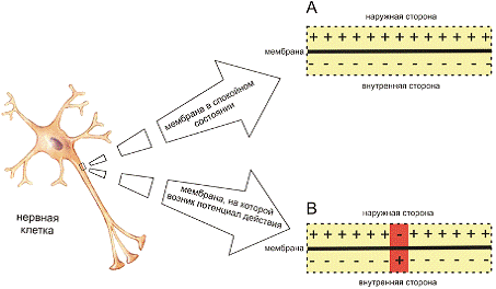 возбудимой клетки в спокойном состоянии (A) и при возникновении потенциала