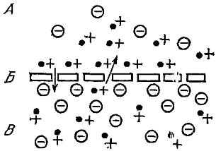 заряженных частиц (катионов), а возле внутренней поверхности - большее