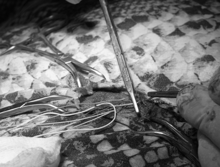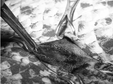 наложением узлового шва. Шов накладывают отдельными нитями длиной 15-25 см