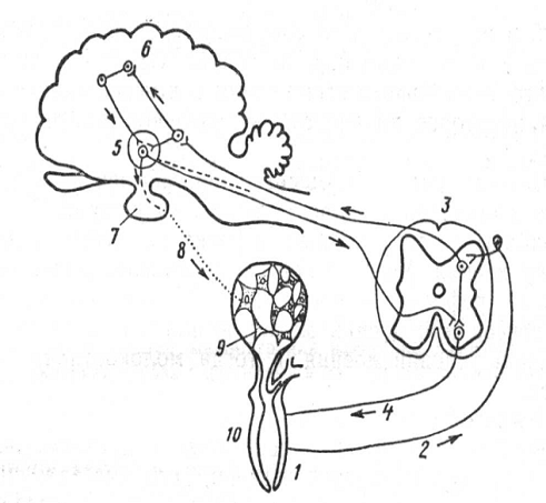 афферентный путь, 3 - спинной мозг, 4 - эфферентный путь, 5 - гипоталамус, 6 -