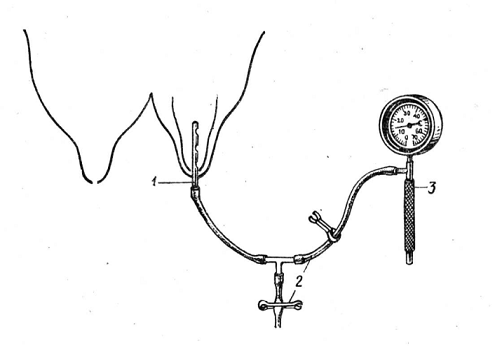 - катетер, 2 - резиновые трубки с зажимами, 3 - манометр.