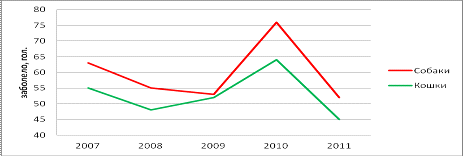 кошки. За исследуемые пять лет идёт снижение заболеваемости собак и кошек
