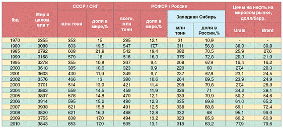 Таблица 1 - Добыча нефти с конденсатом в России и мире в 1970 - 2010 гг.