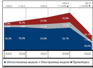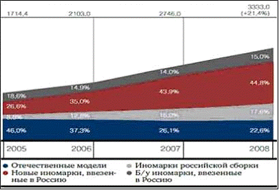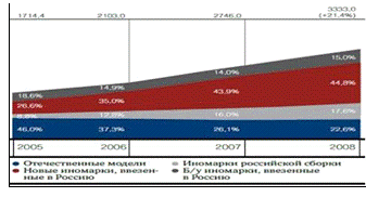 Динамика рынка легковых автомобилей 2005-2008 гг., тыс. штук