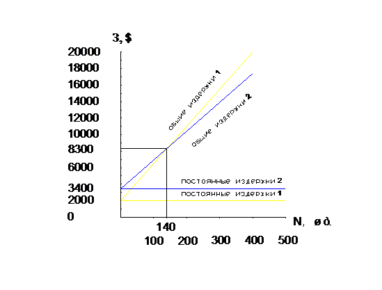 равны:=(Зпост1 - Зпост2)/(Зпер2-Зпер1)= (2000 - 3400) / (35 - 45) = 140 шт.