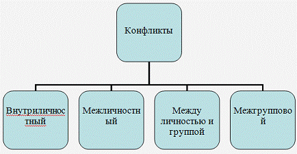 внутриличностный, межличностный, межгрупповой и конфликт между личностью и