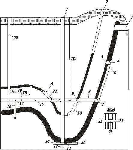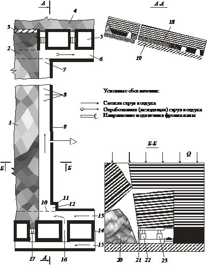 19 - сбойка, 20 - шурф, 21 - бремсберг, 22 - просек