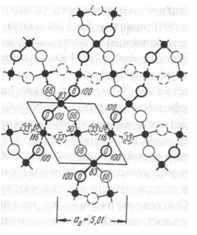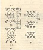 А-расположение центров ионов цилка (черные кружочки) и серы (светлые кружочки);