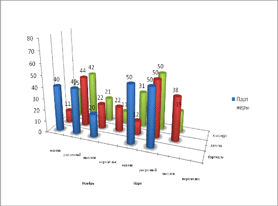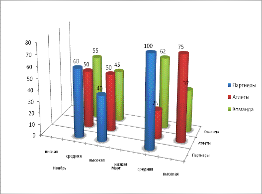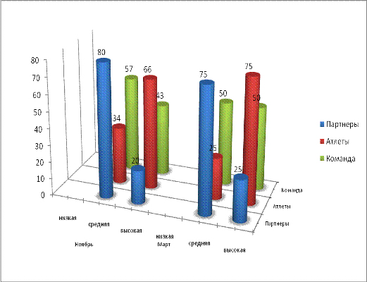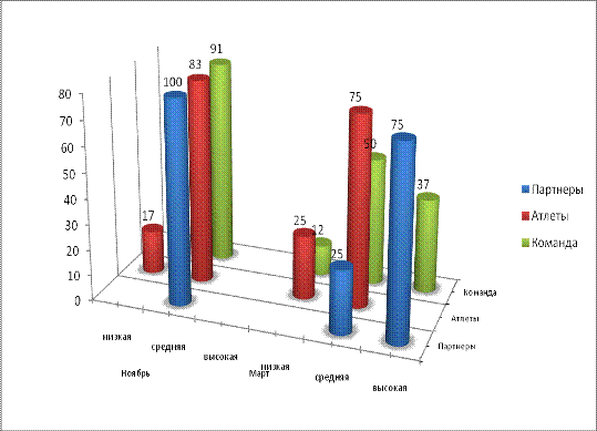 уровне, у 20% партнёров (1 человек) наблюдается высокий уровень. Среди атлетов