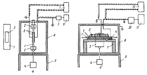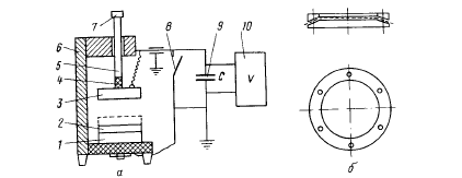 1-образец; 2-электродное устройство; 3-камера; 4 - манометр; 5