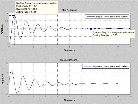 of uncompensated system')% task 1.3(2,1,2), impulse(Wclun),on, legend ('Impulse