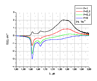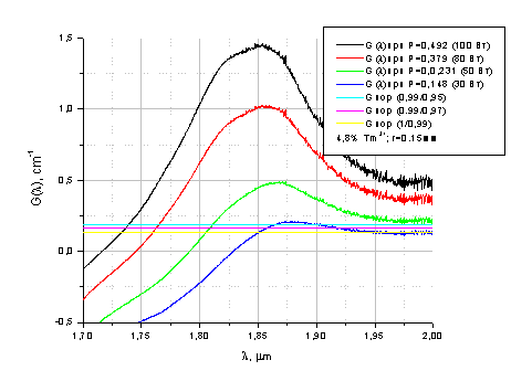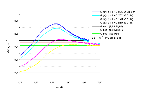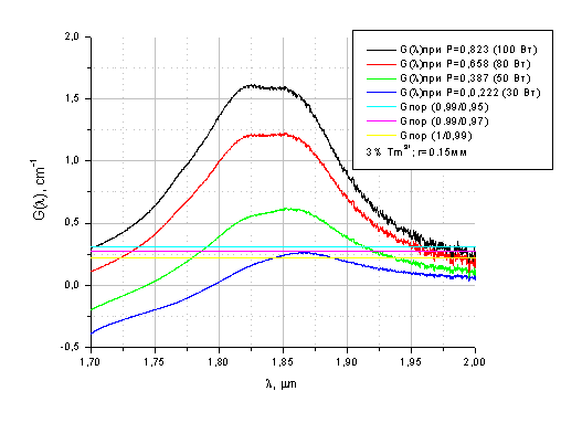 коэффициента усиления от длины волны для диаметра пучка накачки 1 мм для 3% Tm3+