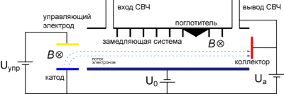 взаимодействие бегущей электромагнитной волны и электронного потока, движущихся