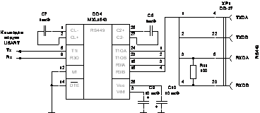 Для формирования уровней сигналов соответствующих интерфейсу RS449 используется мультистандартный преобразователь уровней MXL1543. Схема его включения приведена на рисунке 10.