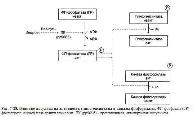 тканями и ее депонирование в форме гликогена, но тормозит глюконеогенез, и,