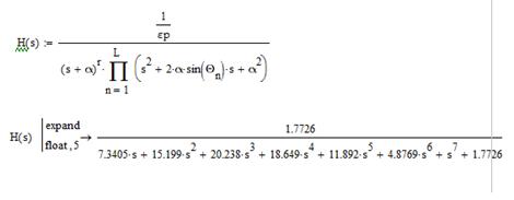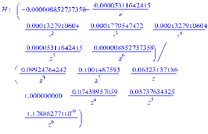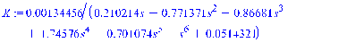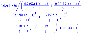 >K:=(0.00134456/(0.210214*s+0.771371*s^2+0.86681*s^3+1.74576*s^4+0.701074*s^5+s^6+0.0514321));