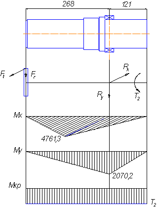 Из суммы проекций на оси хорошо видно, что реакции в подшипнике и