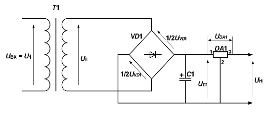 напряжения на базе интегральной микросхемы DA2, двухполупериодного мостового выпрямителя VD2, сглаживающего конденсатора C2 и понижающего сетевого