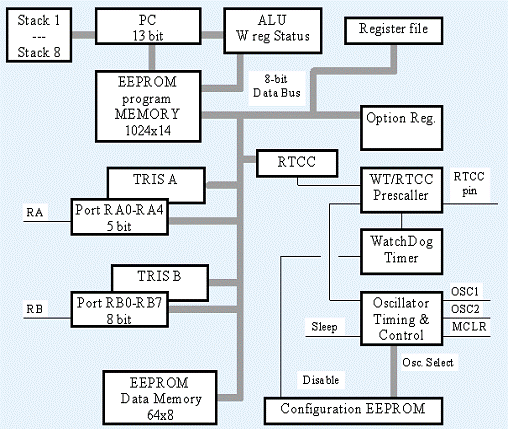 pазpядность 8 бит, память пpогpамм (ППЗУ) имеет pазpядность 12 бит для PIC16C5X