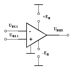 - инвертирующий (-) и неинвертирующий (+) и 1 выход. ОУ питается от двух