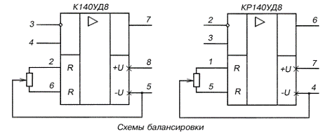 выводов К140УД8: 1 - корпус; 2,6 - балансировка; 3 - вход инвертирующий; 4 -