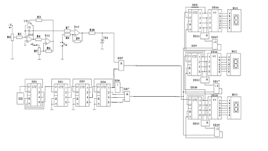 времени подсчитывает импульсы, и отражает результат семисигментном индикаторе HG1…HG3
