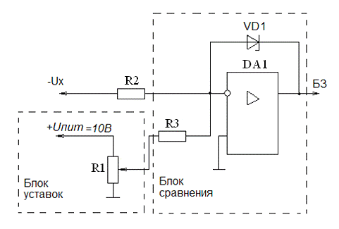 Подводимое к нему питающее напряжение Uпит. = +10В позволяет задать уставку в полном диапазоне контролируемых