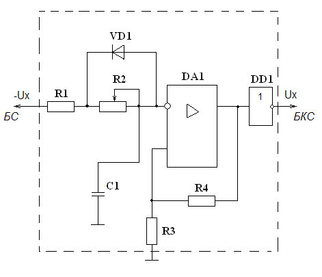 положительного знака, и будет ограничен стабилитроном VD1 на уровне логической «1». Если же входное напряжение Ux меньше напряжение уставки, то