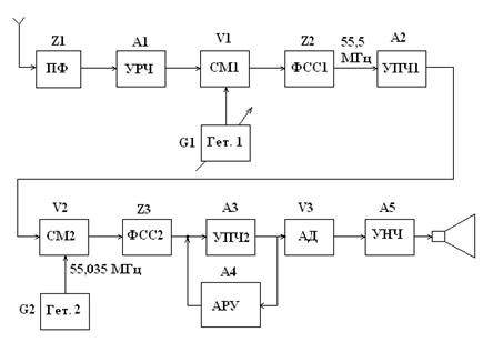 приёмники обычно выполняются по схеме с двукратным преобразованием частоты. Так