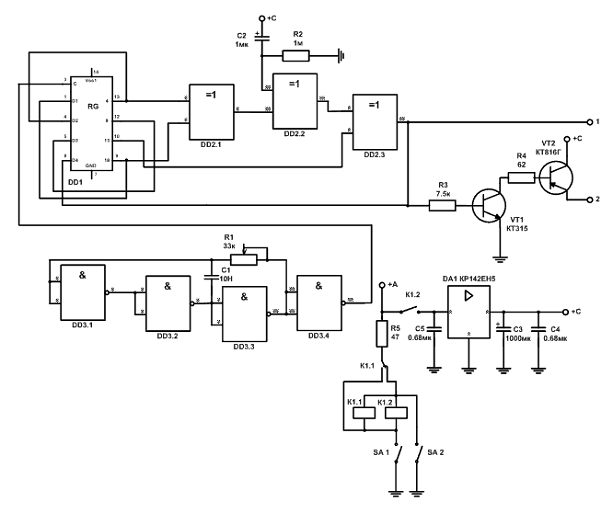 К1.2 на микросхему DA1, но через резистор R5 и замкнутый контакт К1.1