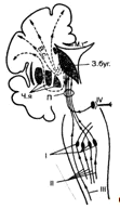перекрещивается на уровне среднего мозга. Волокна заканчиваются на нейронах