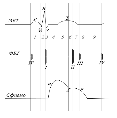 ЭКГ, ФКГ, сфигмограммы. Обозначены зубцы ЭКГ, номера тонов ФКГ и части