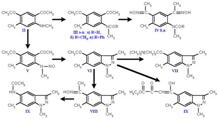 5-ацетил-N,3,6-триметилиндазол (VI). Обе стадии синтеза проходят в мягких условиях