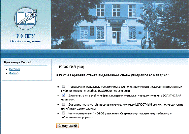 1) При входе в систему онлайн - тестирования пользователь должен