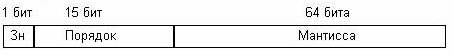 первый бит - знак мантиссы, 16 бит - характеристика и 63бита - мантисса. С