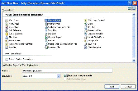 специальную область. Итак создаем Master Page: для этого добавляем новый
