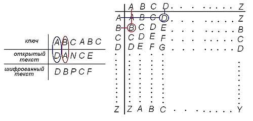 квадрата Виженера, а шифруемую букву в первой строке, затем смотрим, какая