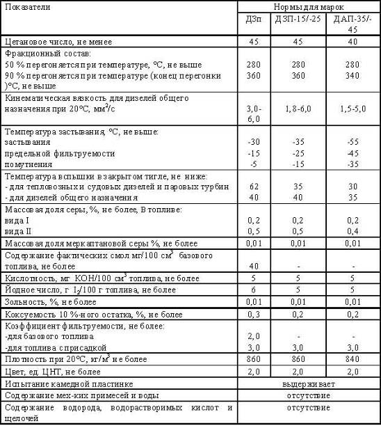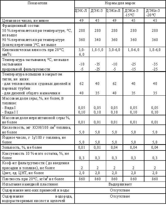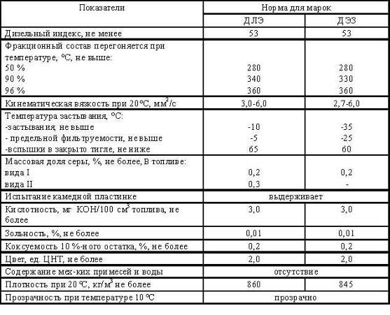 Таблица 1.1. Характеристики дизельного топлива (ГОСТ 305-82)