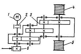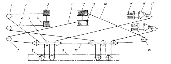 двух лебёдок 7 для перетягивания пакетов звеньев, траверсы 8, двух грузовых