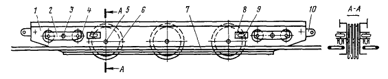 двухступенчатый редуктор, а на раме тележки - тяговый электродвигатель ДК-309А