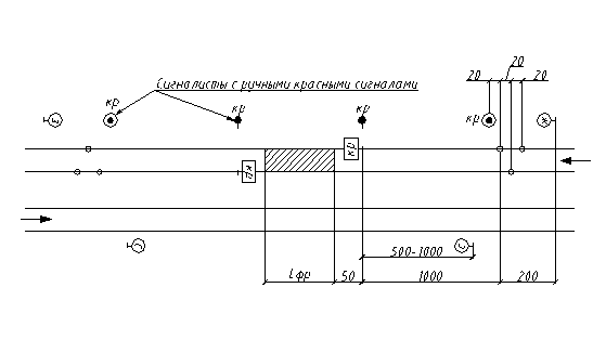 обеих сторон от границы участка работ на расстоянии 50 м переносными сигналами
