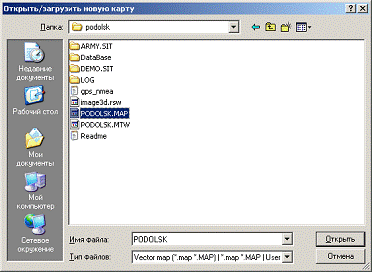 диалоговом окне выбрать файл электронной карты (*.map или *.dir с последующим