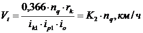 Скорости движения автомобиля на i-х передачах в КП и второй передаче в РК (Vi) определяются по формуле