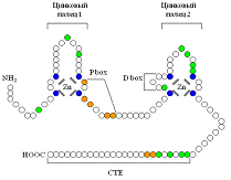 аминокислот, из которых 8 цистеинов образуют 2 структуры типа цинковых пальцев,