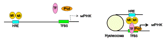 действия рецептора на процесс транскрипции. NR - ядерный рецептор, HRE - гормон-чувствительный