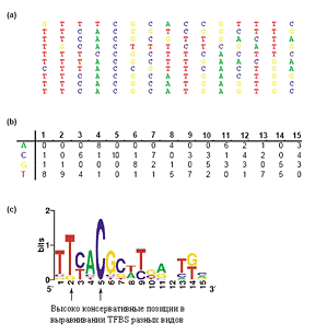 Рис. 7. Конструирование позиционной весовой матрицы (PWM) сайта связывания фактора транскрипции (TFBS). (а) Выравнивание десяти