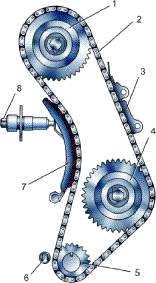 масляного насоса; 5 - звездочка коленчатого вала; 6 - башмак натяжителя цепи; 7