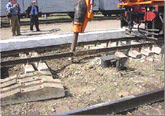 Фатра-17000 в месте выплеска на главном пути с заменой деревянных шпал (убраны)