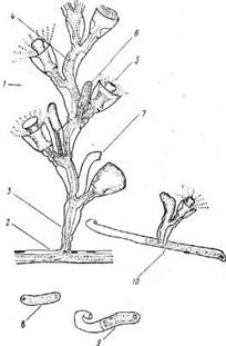 — гидрорйза, 2 — побег, 3 — боковая ветвь, 4 —гонангий, 5 — верхушка гидроризы